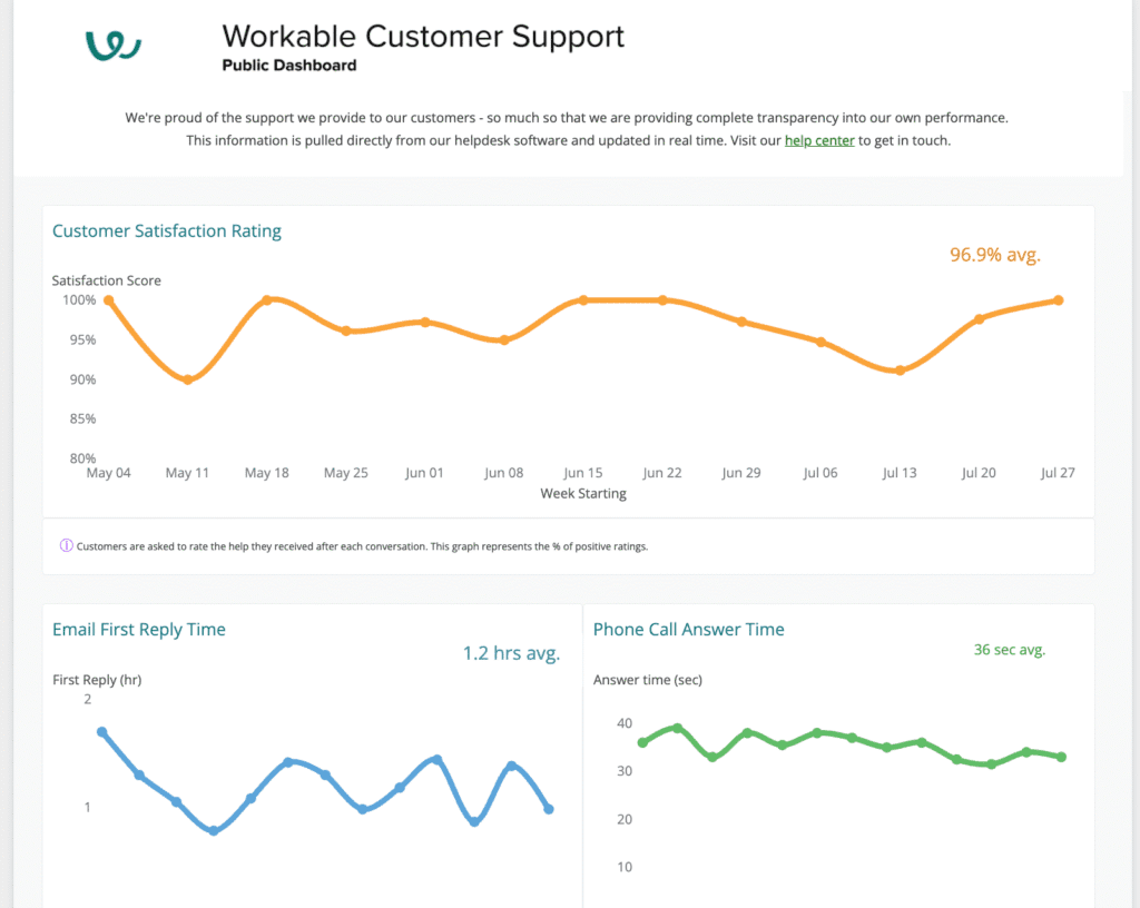 Integrating data across sources and custom metrics, I led reporting for executives, team leaders, individuals, and even a unique public dashboard. Live Support Dashboard Additionally, I introduced measurements like health scores, pain index, support CSAT and topic tracking, and forecasting. At Workable this allowed for 24/5 support (with limited weekends) with a lean team of